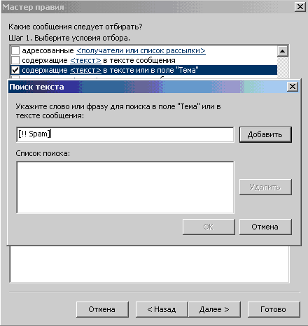 7. Нажмите на “<текст>” и в поле "Поиск текста" введите “[!! Spam]”;