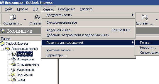 Для настройки Outlook Express на фильтрацию спама, зайдите в меню