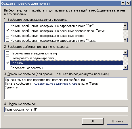 Создадим правило для удаления spam сообщений с сервера без их скачивания на локальную машину:
