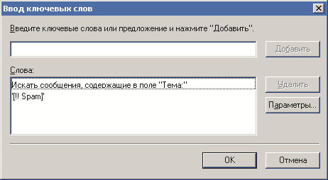 Впишите в появившемся окне фразу "[!! Spam]". Затем нажмите клавишу "Добавить". (При необходимости можете таким же образом добавить на удаление спама строку: "[??" - так обозначаються письма, возможно попадающие в категорию spam'a).