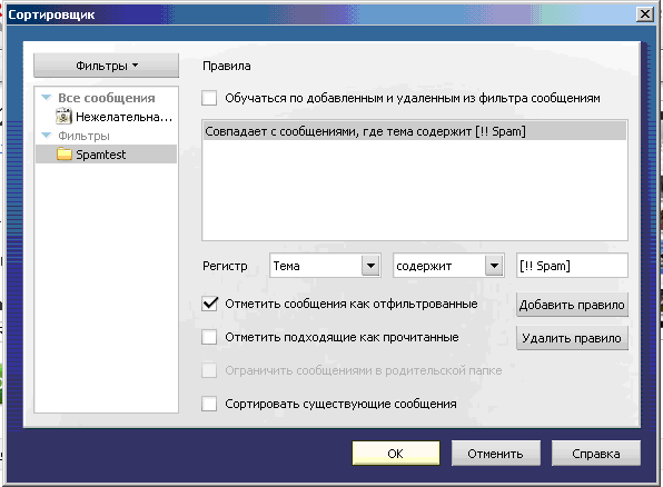 4. Ввести правило «Совпадает с сообщениями, где тема содержит» и в поле для совпадения написать «[!! Spam]».