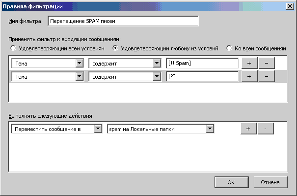 5. В строке «Имя фильтра» введите название: "Перемещение SPAM-писем". В пунктах укажите «Тема», «содержит», «[!! Spam]». При необходимости нажмите на кнопку "+": таким образом, Вы добавляете строку «"[??" –» (так обозначаются письма, возможно попадающие в категорию спама). В разделе «Выполнять следующие действия:» укажите пункты «Переместить сообщение в» и выберите папку, в которую будут перемещаться, письма, помеченные как Spam, в нашем случае это «SPAM».
